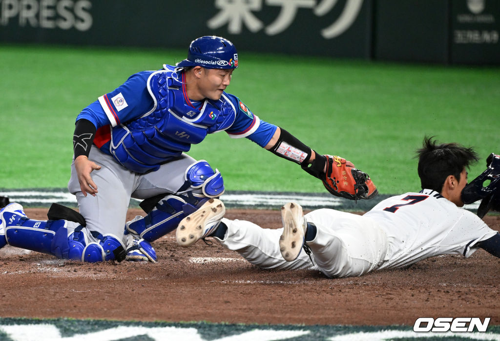 연장 10회말 1사 3루에서 한국 김주원이 김혜성의 1루 땅볼에 홈에서 대만 린자정에 태그아웃 당하고 있다. 2026.03.08 /spjj@osen.co.kr