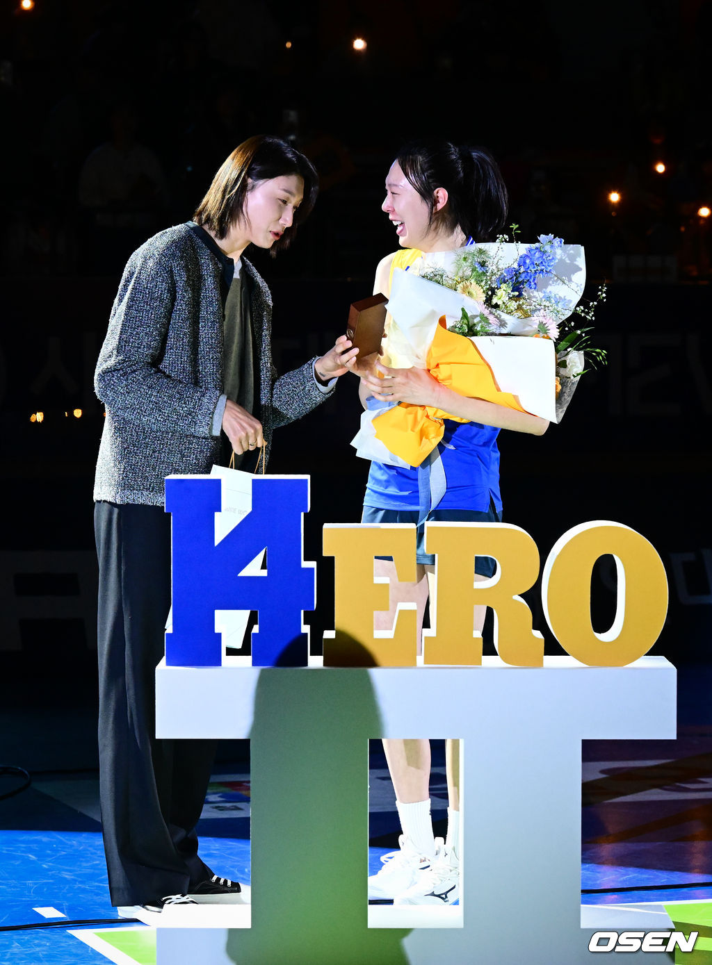 현대건설 양효진이 은퇴식에서 전 배구선수 김연경에게 상패를 받고 있다. 2026.03.08 /cej@osen.co.kr