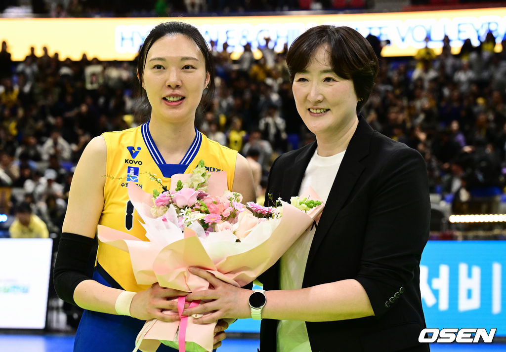 현대건설 양효진이 경기 종료 후 페퍼저축은행 장소연 감독에게 꽃다발을 받고 있다. 2026.03.08 /cej@osen.co.kr