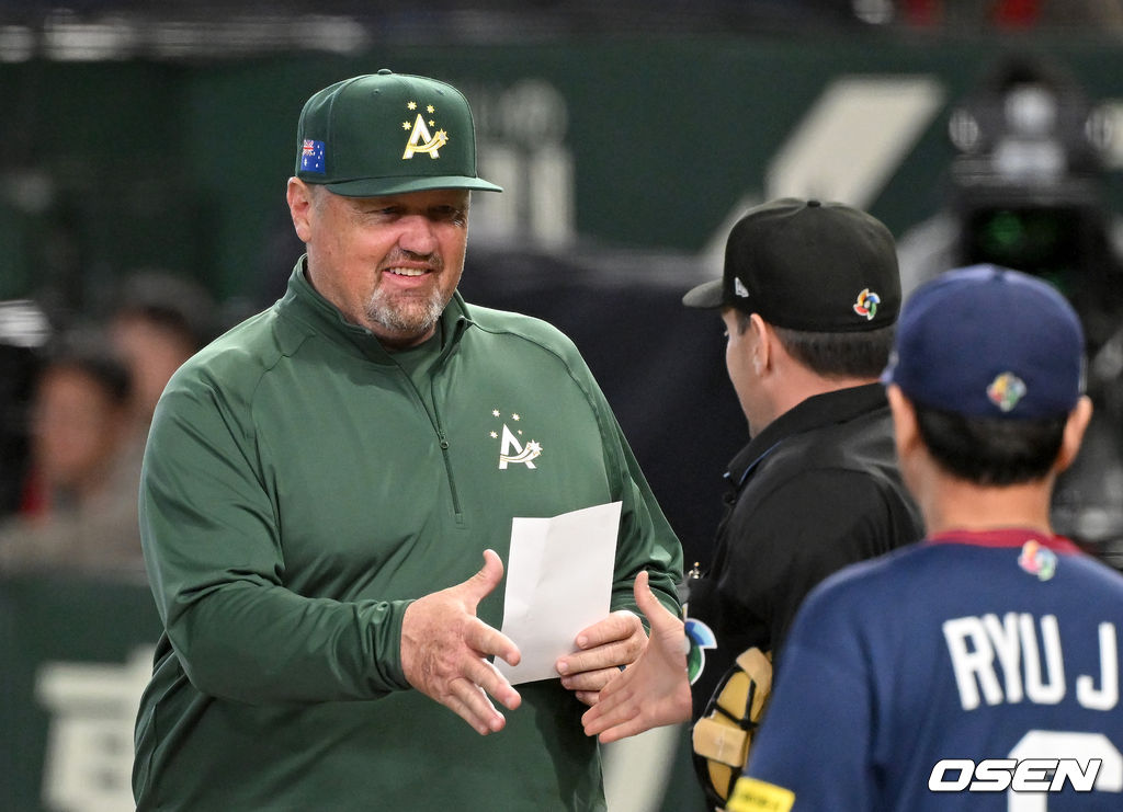 경기에 앞서 호주 데이브 닐슨 감독이 심판과 인사를 나누고 있다. 2026.03.09 /spjj@osen.co.kr