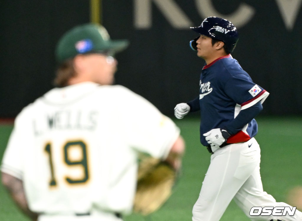 2회초 무사 1루에서 한국 문보경이 우중월 투런 홈런을 치고 그라운드를 돌고 있다. 2026.03.09 /spjj@osen.co.kr