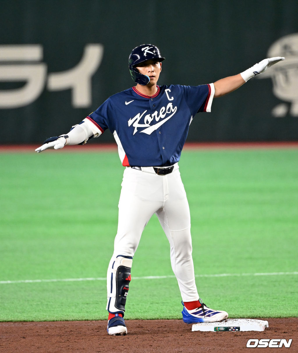 3회초 무사 2루에서 한국 이정후가 우중간 적시 2루타를 치고 환호하고 있다. 2026.03.09 /spjj@osen.co.kr