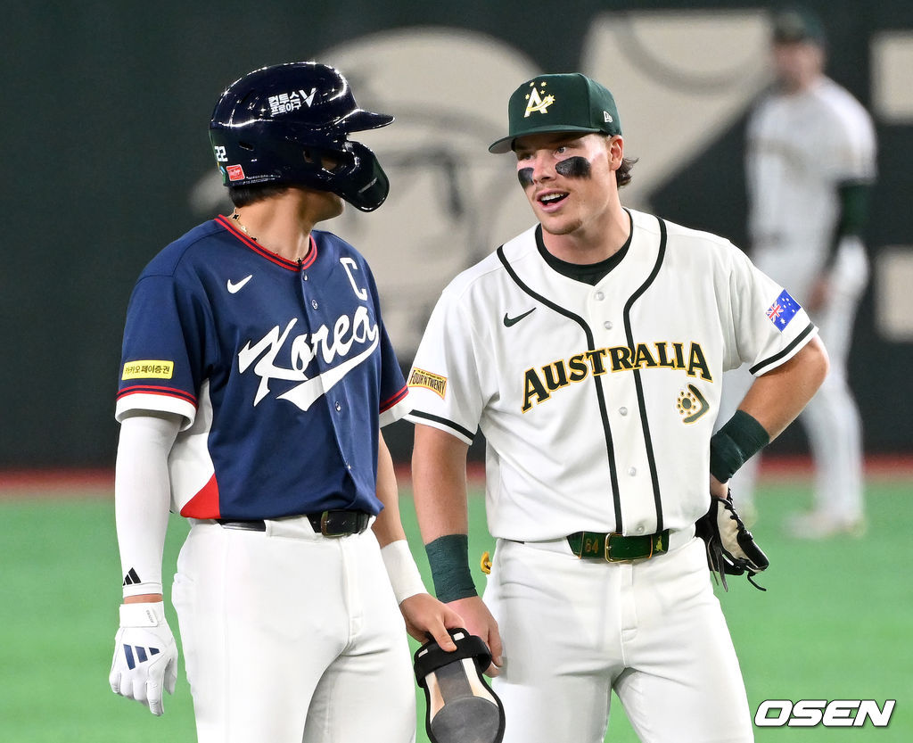 3회초 무사 2루에서 우중간 적시 2루타를 친 한국 이정후가 호주 2루수 트래비스 바자나와 이야기를 나누고 있다. 2026.03.09 /spjj@osen.co.kr