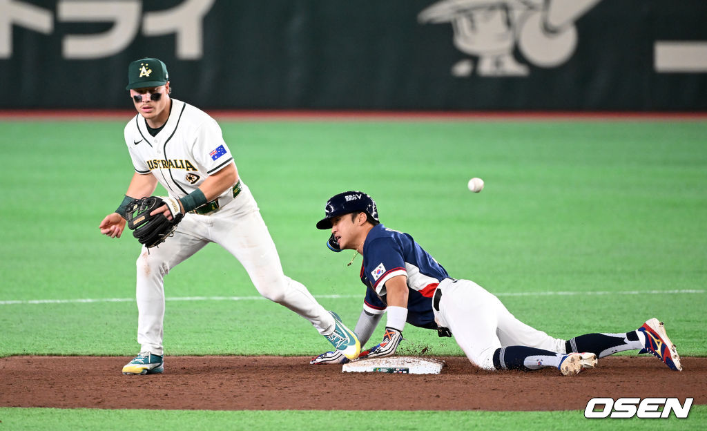 9회초 1사 1루에서 한국 이정후의 땅볼 때 호주 제리드 데일의 2루 송구가 빠지고 있다. 2026.03.09 /spjj@osen.co.kr