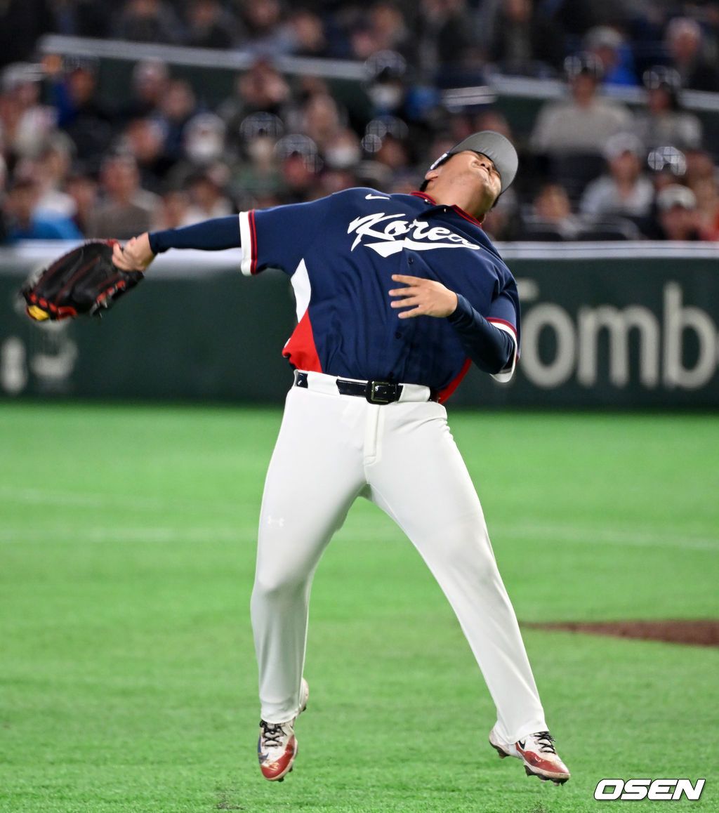 9회말 2사 1루에서 한국 문보경이 호주 웨이드를 뜬공으로 처리하며 환호하고 있다. 2026.03.09 /spjj@osen.co.kr