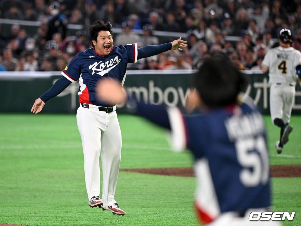 9회말 2사 1루에서 한국 문보경이 호주 웨이드를 뜬공으로 처리하며 환호하고 있다. 2026.03.09 /spjj@osen.co.kr