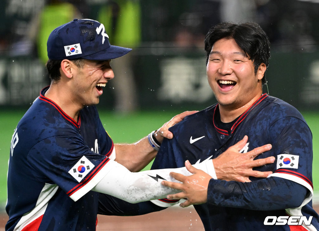 경기 종료 후 한국 셰이 위트컴과 문보경이 승리의 기쁨을 나누고 있다. 2026.03.09 /spjj@osen.co.kr
