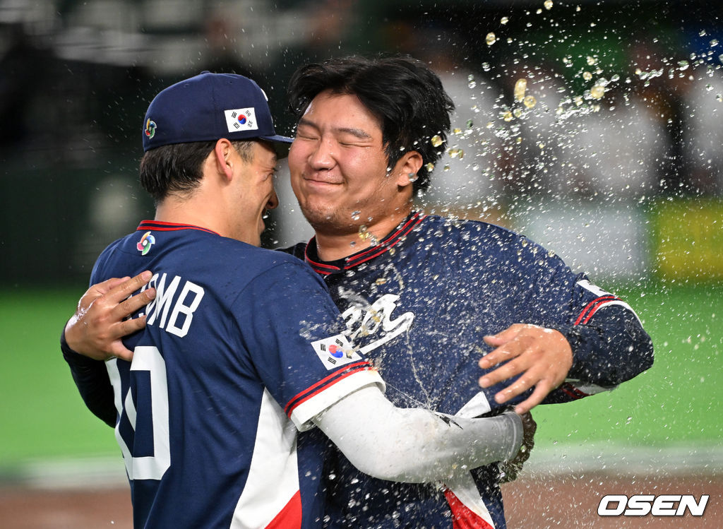 경기 종료 후 한국 문보경이 셰이 위트컴과 승리의 기쁨을 나누고 있다. 2026.03.09 /spjj@osen.co.kr