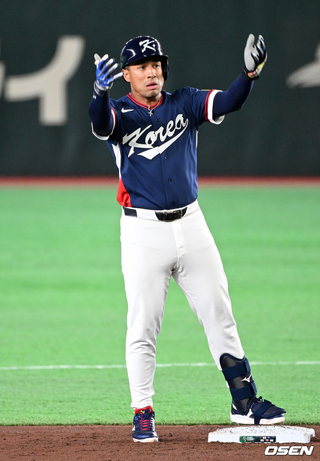 3회초 무사에서 한국 저마이 존스가 중전 2루타를 치고 환호하고 있다. 2026.03.09 /spjj@osen.co.kr