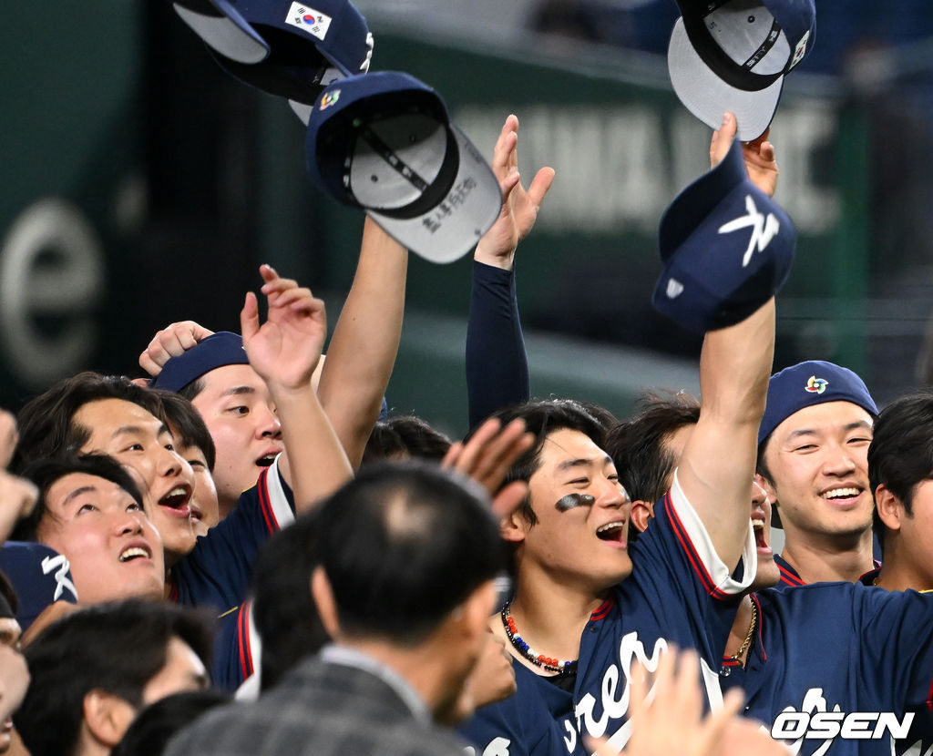 모자 던지며 마이애미행 자축하는 한국 야구 대표팀