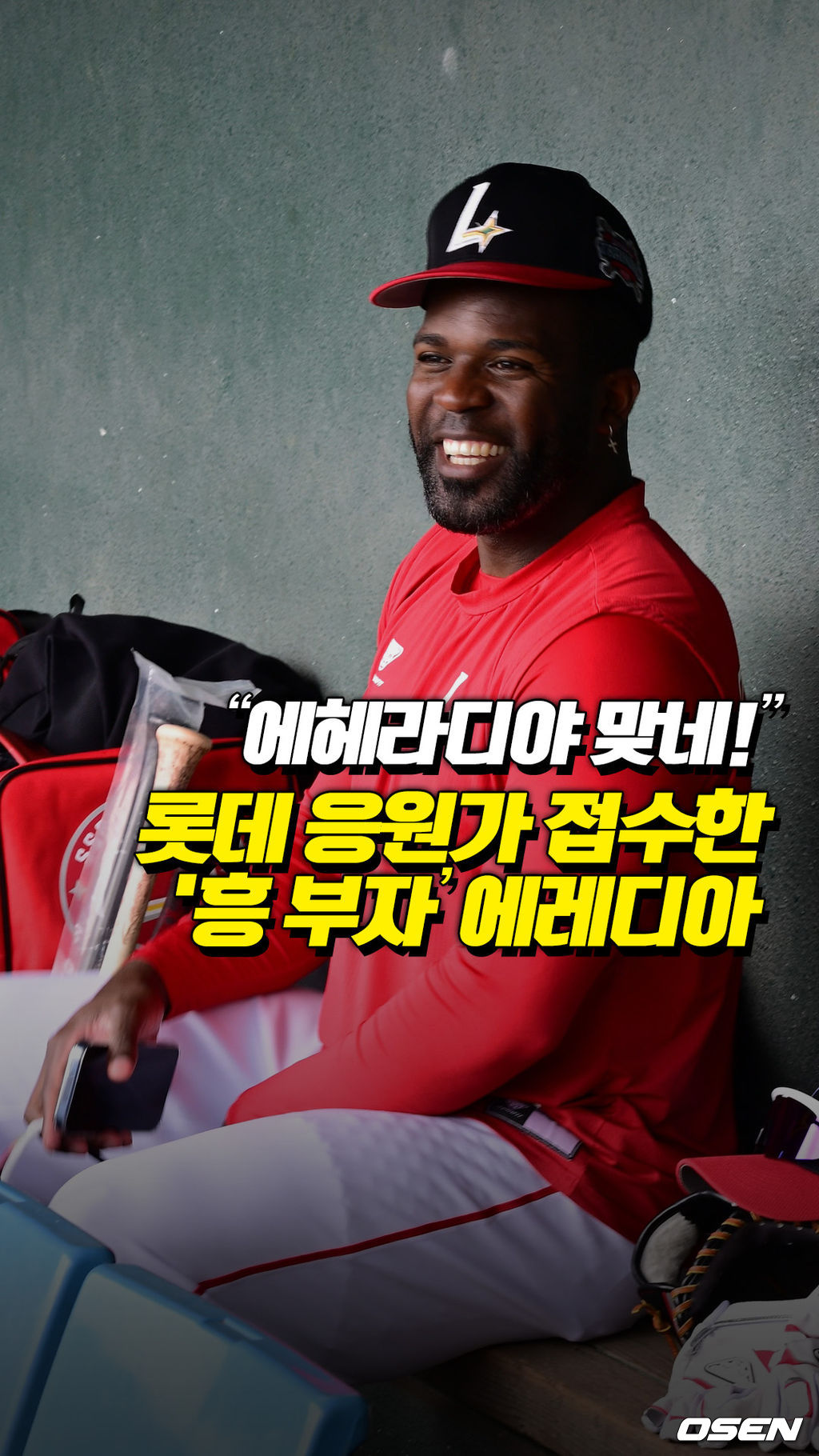 더그아웃에서도 그의 흥은 계속됐다. 롯데 외국인 타자 빅터 레이예스의 타격 훈련이 시작되자 에레디아는 마치 롯데 응원단의 일원이라도 된 듯 응원가를 목청껏 따라 불렀다. 주저함도 없었고, 눈치도 보지 않았다. 익살스러운 표정과 몸짓까지 더해지자 주변에서는 웃음이 터져 나왔다.