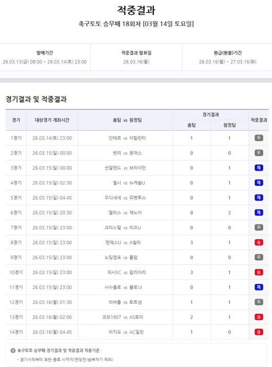 축구토토 승무패 18회차 14경기 가운데 승(홈팀 승) 4경기, 무(무승부) 5경기, 패(원정팀 승) 5경기로 집계됐다.