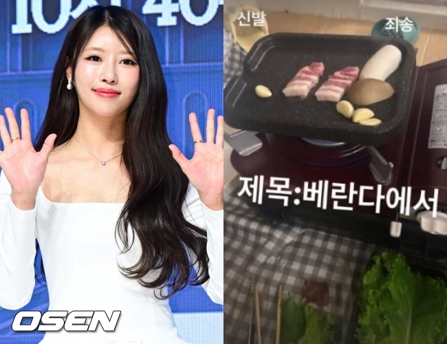 이미주가 공개한 사진에는 삼겹살을 굽고 있는 모습이 담겨 있었다. 직접 밝힌 사진의 제목처럼 베란다에서 휴대용 버너에 불판을 올리고 고기를 굽고 있다. 삼겹살 두 조각과 버섯, 마늘 등이 있었다. 또 이미주는 신발까지 사진에 담기자 ‘죄송’이라는 글자로 가리기도 했다.
