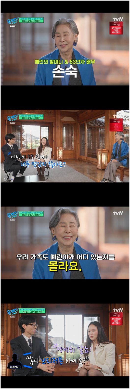 '브리저튼4' 한국인 최초 여성 주연으로 세계에 인기를 얻고 있는 배우 하예린은 할머니 손숙과 함께 등장했다. 손숙은 “작년까지만 해도 손숙 손녀인데, 어느 순간 하예린의 할머니 손숙이 됐다”라며 뿌듯해했다.