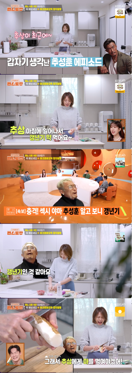 이어 야노 시호는 마를 추성훈에게 먹여야겠다고 말하며 그 이유를 밝혔다. 야노 시호는 “추상이 최근에 갱년기가 와서 약을 먹었어요. 아침에 일어나서 갱년기 약 먹어요. 매일 먹어요. 갱년기인 것 같아요. 추상에게 마를 먹여야겠어”라고 솔직하게 고백해 큰 웃음을 자아냈다.