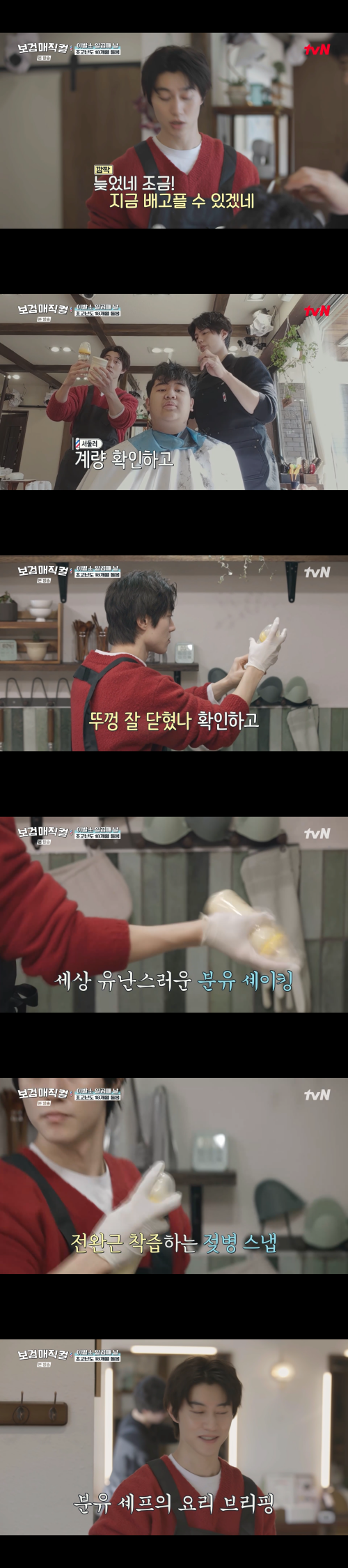 이어 젖병을 흔들 때는 마치 칵테일을 만드는 듯한 손목 스냅으로 분위기를 반전시켰다. 정성껏 만든 분유를 받은 막내는 기분이 좋은 듯 웃음을 보였고, 이를 지켜보던 출연진들도 흐뭇한 미소를 지었다.