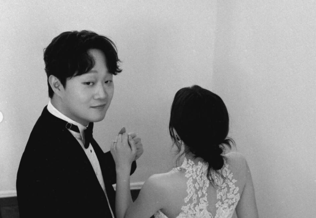 이어진 사진에서는 로우번 헤어 스타일에 오프숄더 웨딩드레스를 입은 신부의 손을 잡고 카메라를 바라보는 장면이 시선을 끌었다. 특히 신부의 얼굴은 공개되지 않았지만, 단아한 분위기와 뒷모습만으로도 눈길을 사로잡았다.