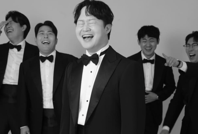 공개된 사진에는 턱시도를 입은 정재형이 동료 개그맨들과 함께 환하게 웃고 있는 모습이 담겼다.