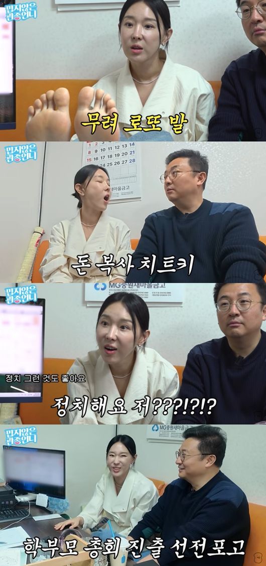 특히 백문은 이지혜 발을 보더니 “도의원 정도 나가도 될 팔자다”라고 해 눈길을 끌었다. 이지혜는 “저 정치하냐”라며 깜짝 놀랐고, 제작진이 학부모 회장을 제안하자 “나가야겠다”라고 맞장구쳤다. 이에 백문은 “마음만 먹으면 엄청 잘할 것”이라고 덧붙였다.