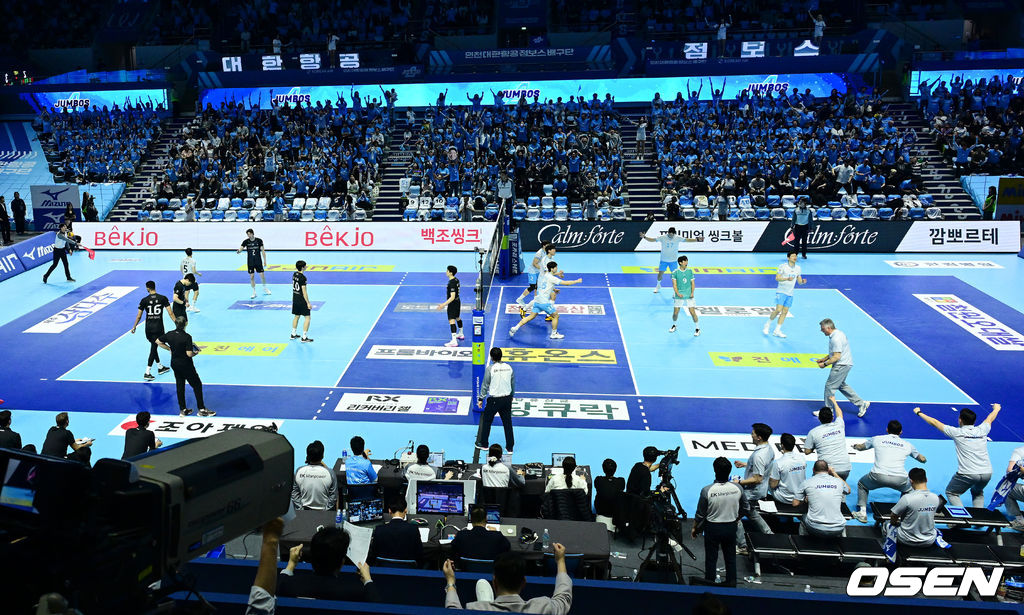 정규리그 1위 대한항공은 우리카드와 플레이오프(2승)를 거쳐 올라온 2위 현대캐피탈에 기선을 제압하며 우승확률 75%(20번 중 15번)를 거머쥐었다.