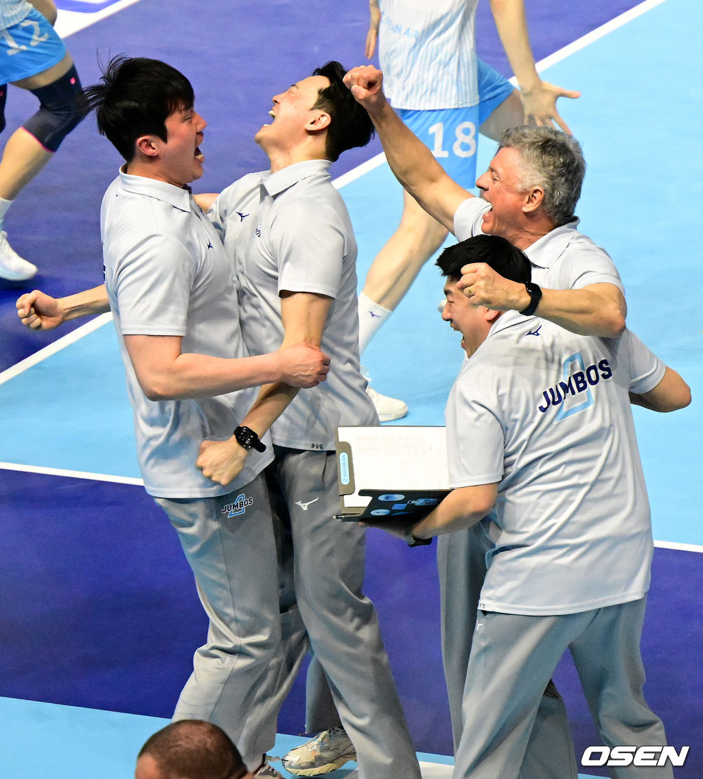 경기를 마치고 대한항공 헤난 감독이 코칭스태프와 승리를 기뻐하고 있다. 2026.04.02 / jpnews@osen.co.kr