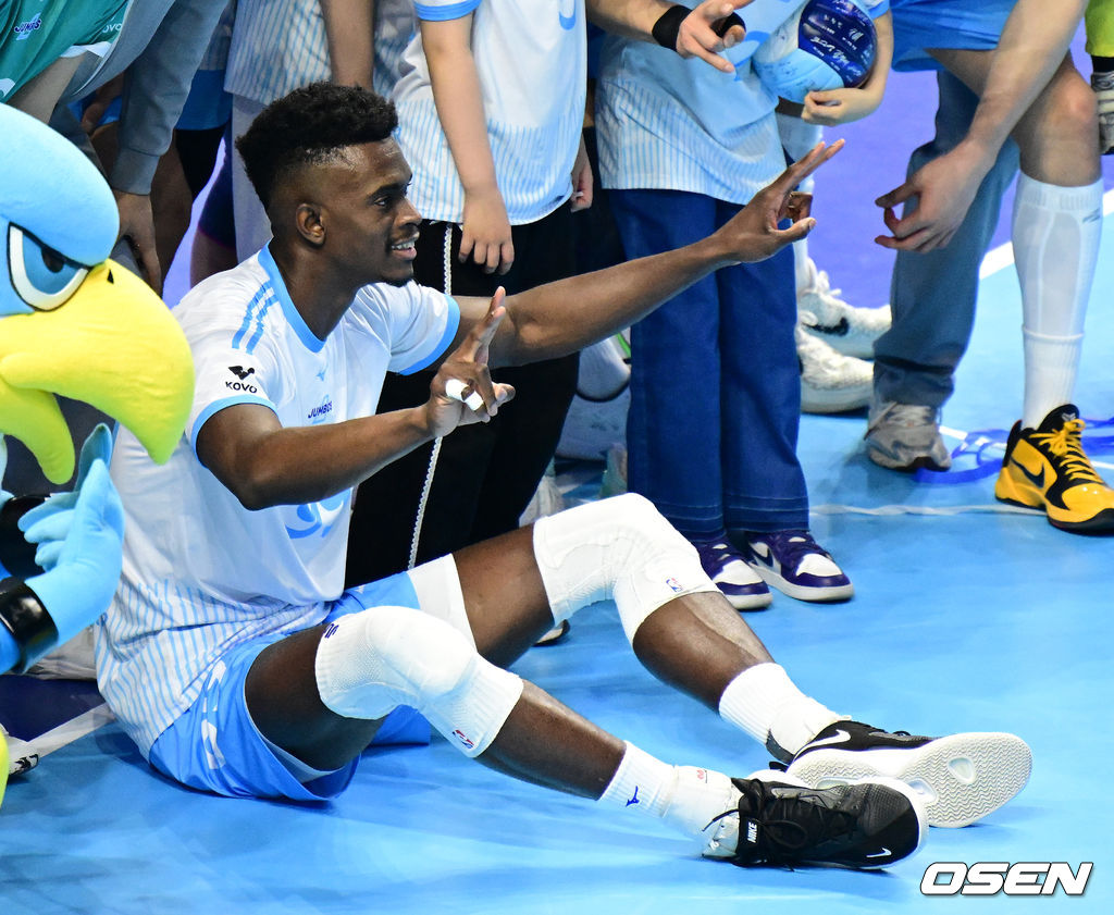 경기를 마치고 대한항공 마쏘가 승리를 기뻐하고 있다. 2026.04.02 / jpnews@osen.co.kr