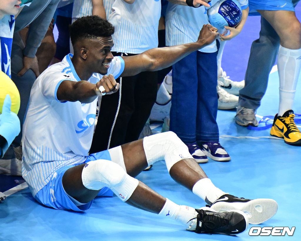 경기를 마치고 대한항공 마쏘가 승리를 기뻐하고 있다. 2026.04.02 / jpnews@osen.co.kr