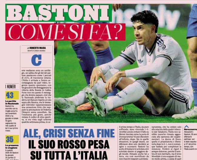 단 한 장면이 모든 것을 바꿨다. 알레산드로 바스토니(인터 밀란)가 커리어의 갈림길에 섰다. 이탈리아 축구에는 고통스러운 밤이었고, 한 수비수에게는 운명을 뒤흔든 경기였다.
