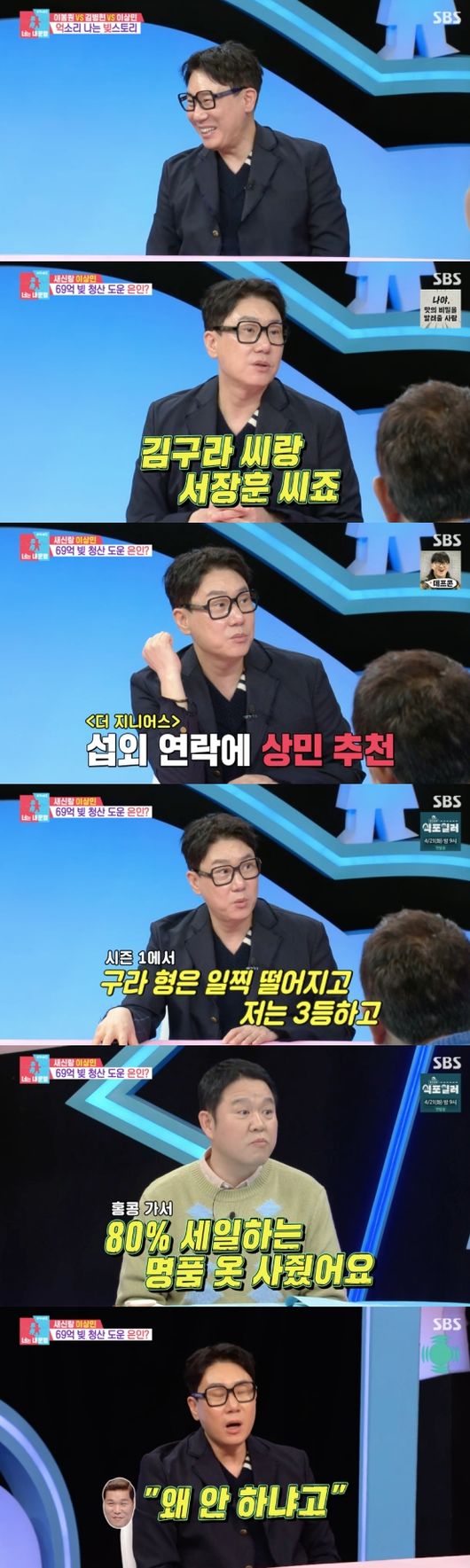 이상민은 빚 청산을 도운 은인으로 서장훈, 김구라를 꼽았다. 그는 “구라 형이 ‘더 지니어스’라는 프로그램에 나를 추천해 줬다. 시즌 1에서 구라 형은 일찍 떨어지고 저는 3등하고. 다음 시즌에서 제가 우승해서 1억 600만 원을 받았다”라고 설명했다.