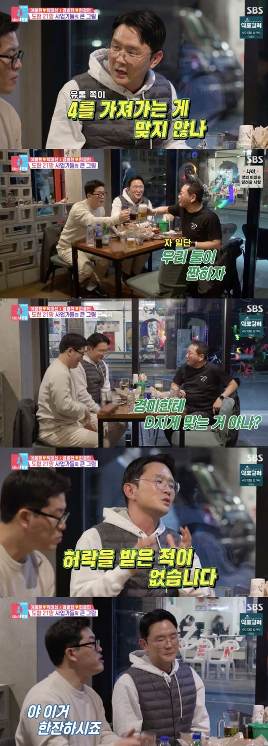 윤형빈은 “셋이 하면 유통 쪽이 4를 가져가는 게 맞지 않나”라고 제안했고 이봉원은 “경미한테 허락은 받았냐”라고 물었다. 윤형빈은 “한 번도 아내에게 허락을 받은 적이 없다. 그냥 한다”라고 말했다.
