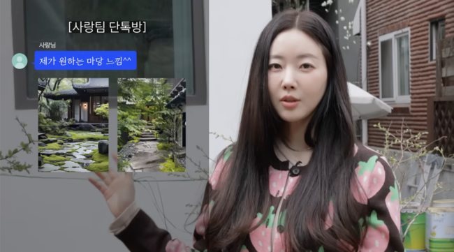 이날 김사랑은 마당에서 오프닝을 시작했다. 그는 “여기는 원래 사진 보내준 거, 아담한 정원으로 동양적인 느낌으로 꾸미고 싶었다. 사진에 보면 돌 비슷한 느낌으로 하려고 했다. 좀 운치있는 나무를 심고”라고 입을 열었다.
