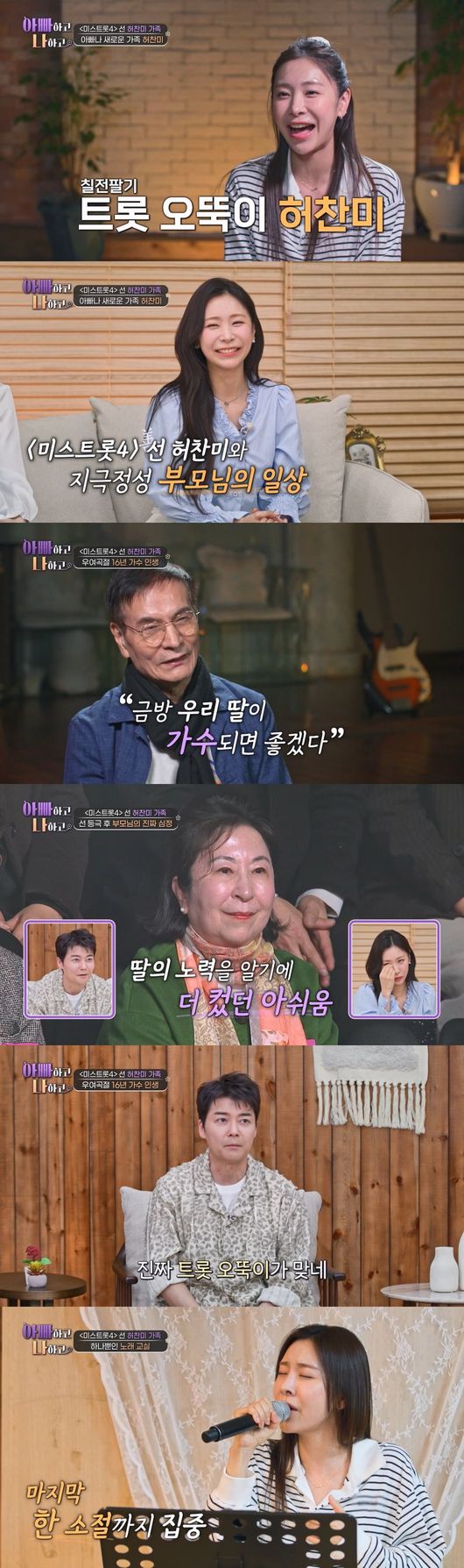 가족들의 눈물겨운 사랑도 공개된다. ‘사랑꾼’ 아버지와 딸을 위해 ‘미스트롯4’ 동반 출전까지 결심했던 ‘애교 만점’ 어머니는 허찬미의 가장 든든한 버팀목이었다. 무엇보다 ‘미스트롯4’ 선 당선 이후 처음으로 듣게 된 부모님의 진심 어린 속마음에 허찬미는 결국 참았던 눈물을 터뜨려 현장을 숙연하게 만들었다.