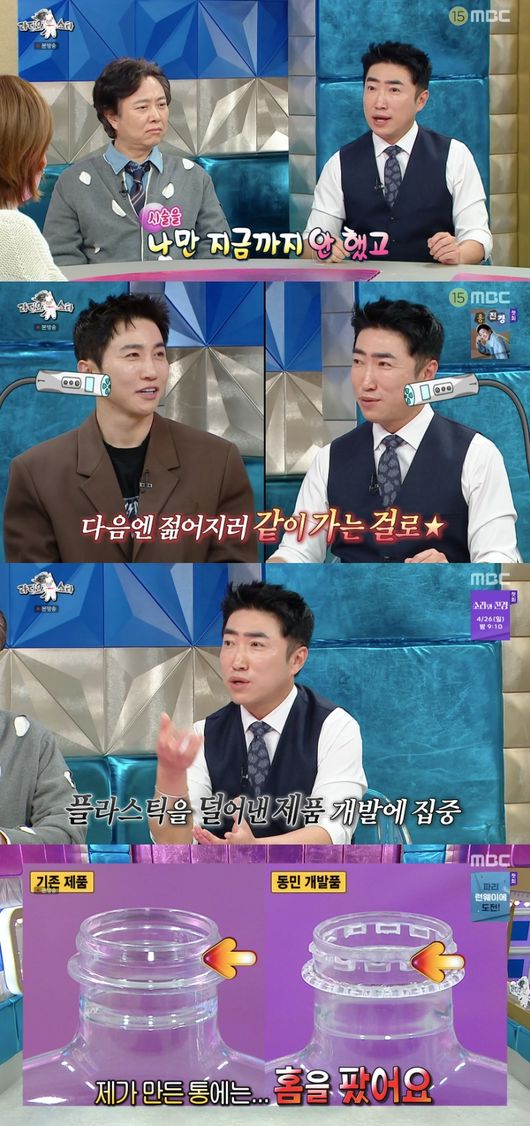 특히 장동민은 “친환경 쪽에서 일한 지 오래됐다 보니까 요즘 플라스틱 사용 줄여야 한다고 하는데 실질적으로 사용 안 할 수 없다. 그래서 질량을 줄여보자, 필요없는 부분을 덜어내서 해보면 어떨까 해서”라며 기존 제품과 개발한 제품 두개를 공개했다. 생수 병 기준으로 입구에 홈을 파서 질량을 줄인 것으로, 장동민은 “보통 500㎖ 생수명 무게가 10g인데 이렇게 하니 1.5g이 감소하더라. 생수병 10개를 사용하면 생수병 하나를 안 쓴 효과"라며 "방송 기준 다음달부터 출시 예정"이라고 밝혔다.
