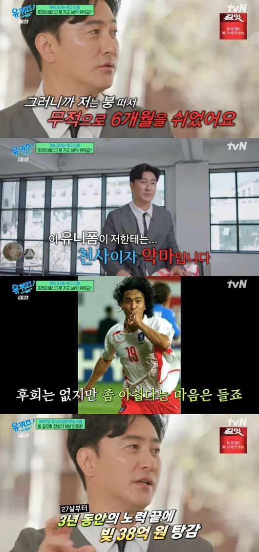 당시 큰 돈이 없던 안정환은 무직으로 6개월을 쉬었고, 선수 커리어가 끝날 수도 있다는 생각까지 하게 됐다고. 그는 “운동을 관둘까 했다. 나라를 위해 뛴 것밖에 없는데 왜 이런 처지 받아야 하나 너무 억울했다”고 토로했다.