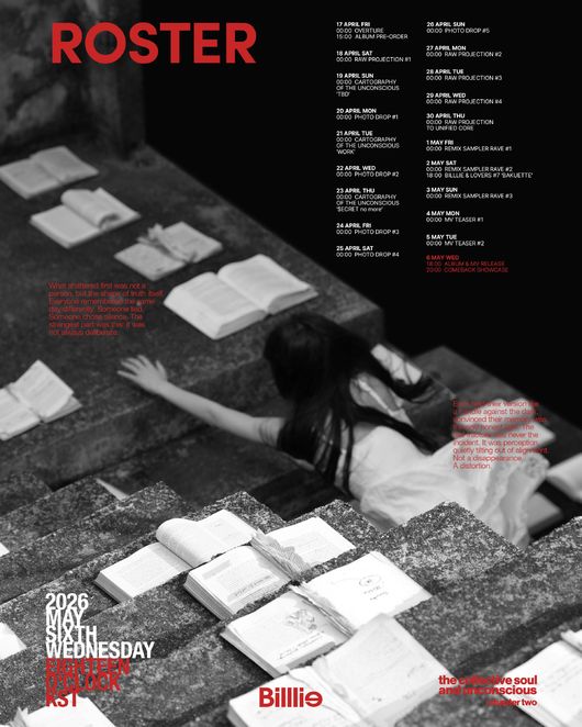 공개된 스케줄러 이미지는 계단마다 펼쳐진 책들과 그 사이로 다급하게 손을 뻗는 소녀의 모습이 담겨 의미심장한 분위기를 자아낸다. 앞서 공개된 포스터에 이어 ‘비밀’을 둘러싼 미스터리한 오브제들이 곳곳에 배치되며, 빌리가 이번 신보를 통해 어떤 거대한 서사를 풀어낼지 팬들의 호기심을 높인다.