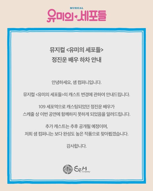 이에 제작사 측은 "109 세포역으로 캐스팅되었던 정진운 배우가 스케줄 상 이번 공연에 함께하지 못하게 되었음을 알려드립니다"라며 "추가 캐스트는 추후 공개될 예정이며, 저희 샘 컴퍼니는 보다 완성도 높은 작품으로 찾아뵙겠습니다"라고 덧붙였다.