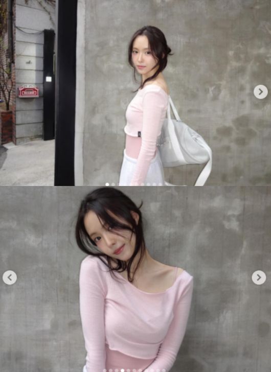 사진 속 손나은은 핑크색 오프숄더 톱과 회색 조거 팬츠를 입고 발레코어 룩을 선보였다. 카메라를 향해 은은한 미소를 띈 그는 청순하면서도 우아한 분위기를 자아냈다.