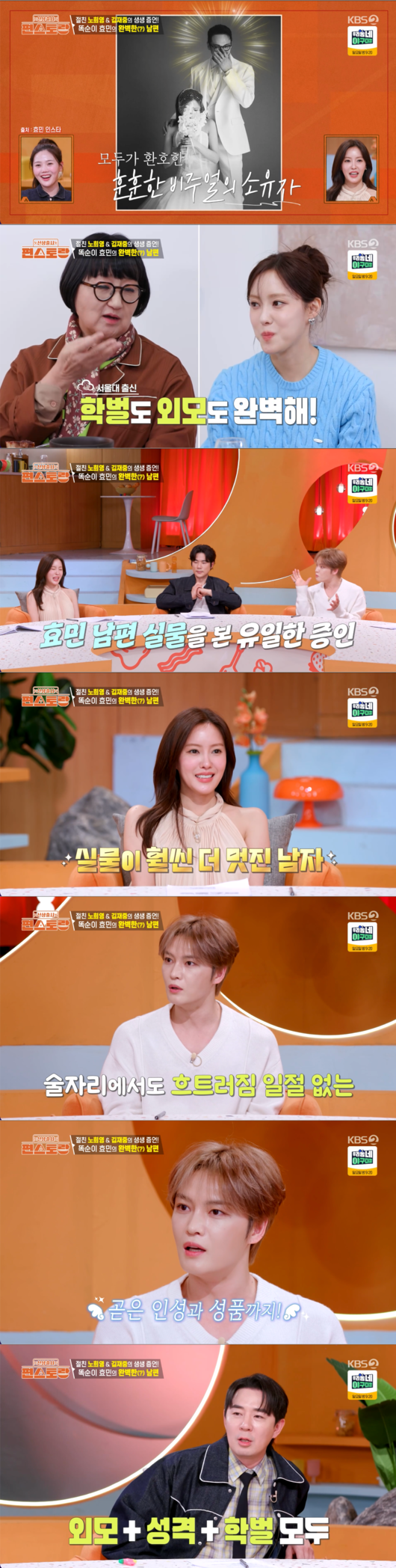 스튜디오에서 이를 본 김재중 또한 효민 연인의 독보적인 아우라를 증언하며 "실물이 엄청나다. 술 한번했는데 흐트러짐이 없다. 인성 성품 다 좋다. 정말 완벽하시더라고요"라고 언급, 외적 조건뿐만 아니라 흐트러짐 없는 자기관리와 인품까지 완벽한 ‘사기 캐릭터’급 면모를 치켜세웠다.