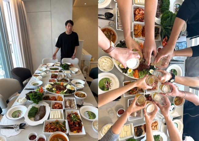 특히 메인 요리를 중심으로 다양한 한식 메뉴가 정돈된 플레이팅으로 담겨 있어 마치 전문 레스토랑을 연상케 했다. 이어진 사진에서는 지인들이 함께 잔을 들고 건배를 나누는 모습이 포착돼 훈훈한 분위기를 더했다.
