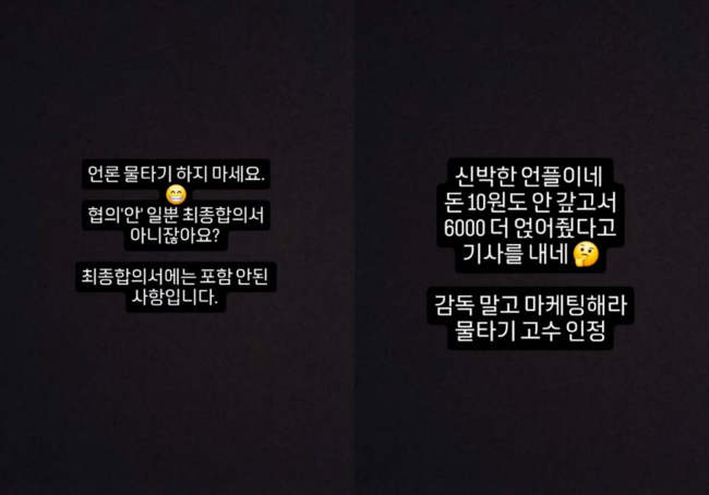 그러면서 "근데 진짜 재능있다. 돈 10원도 안갚고서는 6000 더 얹어줬다고 언플을 한다. 감독 말고 마케팅으로 전업하는게 어떤가 싶다. 물타기 고수 쌉인정"이라고 저격하기도 했다.