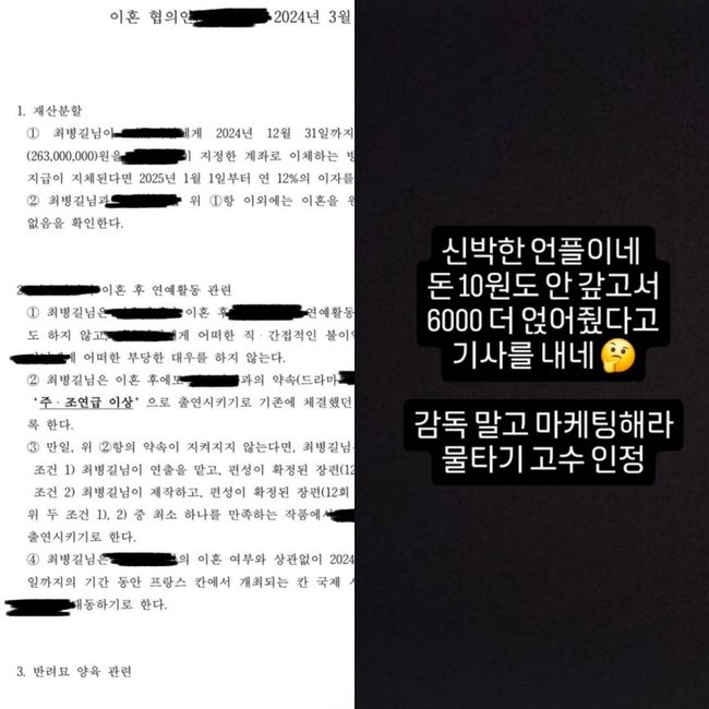 이처럼 이번 갈등은 단순한 감정싸움이 아니라, 이혼 협의 과정에서 오갔던 문서의 성격과 최종 합의 내용, 재산분할금 지급 여부, 과거 사업 채무의 책임 범위를 둘러싸고 양측 입장이 정면으로 충돌하는 양상이다.