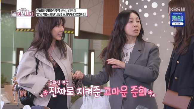 황신혜는 예고 없이 찾아온 김준희를 발견하자마자 반가움 섞인 환호를 내지르며 환영했다. 김준희는 "언니가 평소 제가 하는 일에 항상 직접 와서 응원해 주신다"며 "그 고마움에 보답하고 싶어 달려왔다"라고 밝혀 주변의 부러움을 자아냈다.