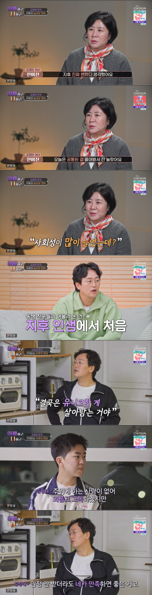 지후 군이 집에 놀러 온 동생의 친구들과 자연스럽게 어울리며 대화를 주도하는 장면이 담겼다. 평소와 달리 친구들의 눈높이에 맞춰 대화를 이끄는 아들의 모습에 김정태의 아내는 "지후가 진짜 변했다고 생각했다"며 놀라움을 감추지 못했다. 그녀는 "예전에는 오로지 본인의 관심사 위주로만 이야기를 했었는데, 오늘은 공통된 화제를 먼저 물어보더라. 사회성이 정말 많이 늘었다"며 대견해했다.