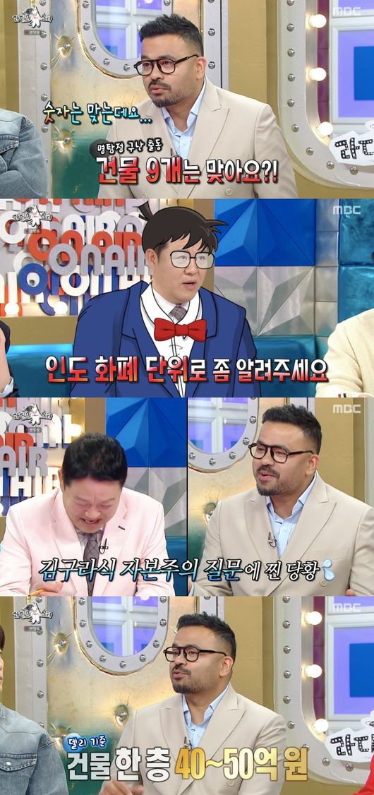 또 럭키는 “저 한국에서 대출이 안되지 않냐. 인도에서 대출 받아서 한 거다”라고 했다. 그러자 김구라는 “건물 중에 그래도 가치가 가장 높은 건물을 인도 화폐 단위로 좀 알려주세요”라고 단도직입적으로 물었다.