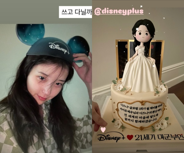 공개된 사진 속에는 디즈니+ 측에서 아이유에게 보낸 케이크와 귀여운 모자 선물이 담겨 있다. ‘21세기 대군부인’ 글로벌 플랫폼인 디즈니+는 “글로벌 1위가 될 채비를 하라!”라며 “아이유 배우님과 디즈니+의 환상 케미, 전 세계의 마음에 닿도록 끝까지 함께하겠습니다”라며 성희주 캐릭터의 케이크를 선물했다. 여기에 또 다른 선물 디즈니 미키 마우스 모자를 쓴 아이유는 “쓰고 다닐까”라며 인증샷도 덧붙여 시선을 사로잡았다.