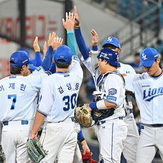 2026.04.02 21: 065-2 승리 하이파이브하는 삼성 선수들