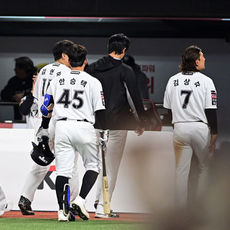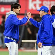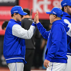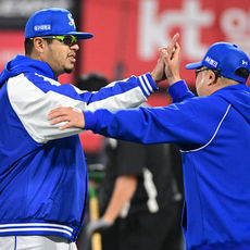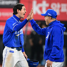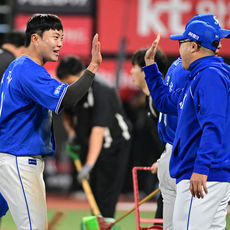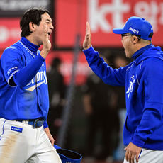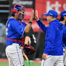2026.04.03 21: 28강민호 '웃으며 하이파이브'
