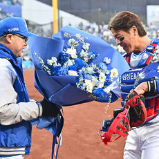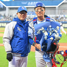 2026.04.01 19: 13축하 꽃다발 받는 강민호, KBO리그 역대 최초 2500경기 출장 기록