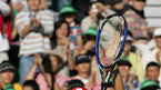 샤라포바가 3일 서울 올림픽공원에서 끝난 여자프로테니스(WTA) 2004한솔코리아오픈 결승에서 폴란드의 도마초프스카를 2-0으로 물리친 뒤 라켓을 들어 박수치는 동작을 취하며 관객의 박수를 유도하고 있다./손용호기자