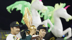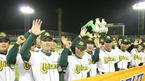 5일 수원구장에서 열린 SK와 시즌 마지막경기에서 승리를 거두고 자력으로 한국시리즈에 직행한 현대선수단이 2004시즌 정규리그 1위를 자축하는 플래카드 앞에서 팬들의 환호에 답하고 있다. /수원=손용호 기자